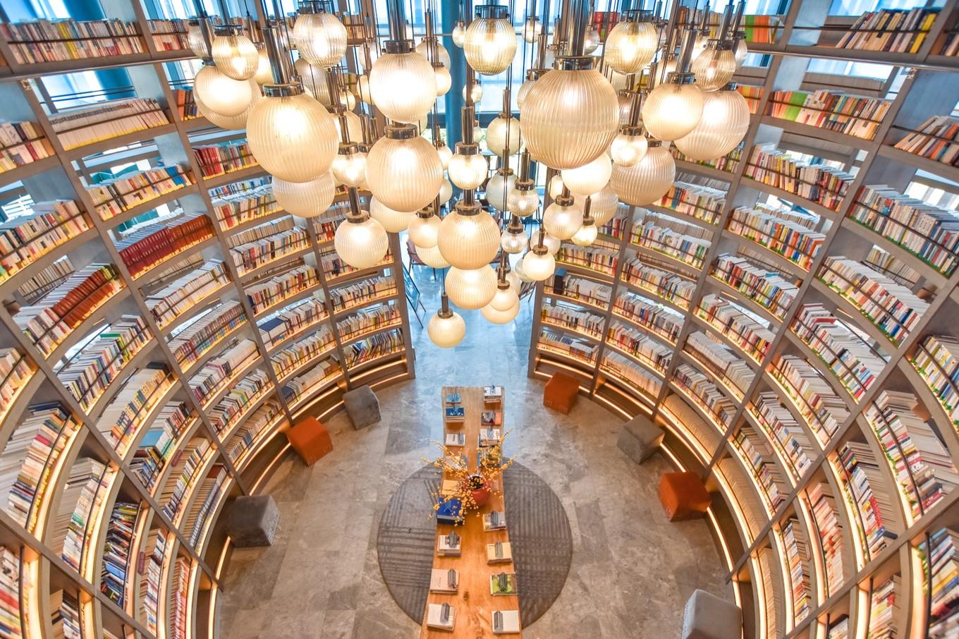 書架中心擺放的木制長桌上也放滿了書籍,頭頂?shù)拇蟮鯚籼峁┝顺渥愕墓饩€。讀書館不定期會有分享會之類的活動(dòng),就是在這個(gè)巨型書架中央舉辦的呢。