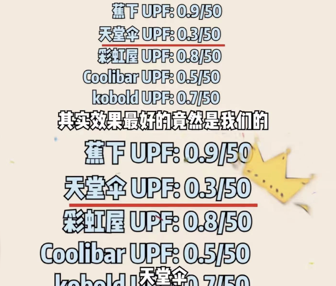 但蕉下防曬傘UVA阻擋率達(dá)為0.9/50,而天堂防曬傘UVA阻擋率為0.3/50,該博主認(rèn)為,天堂防曬傘的防曬果是7個品牌中果好的。