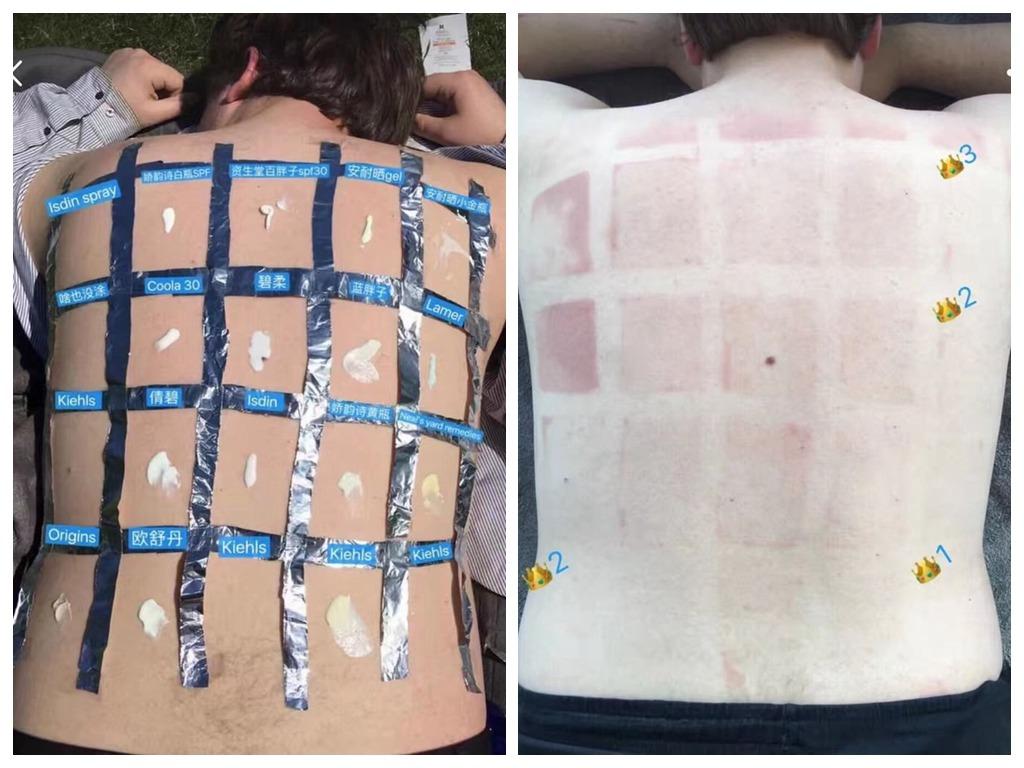 被冰袖遮蓋的測試卡呈現(xiàn)淺紫色,而沒有任何防護(hù)的測試卡從白色變成紫色,表明已經(jīng)被曬黑了。
