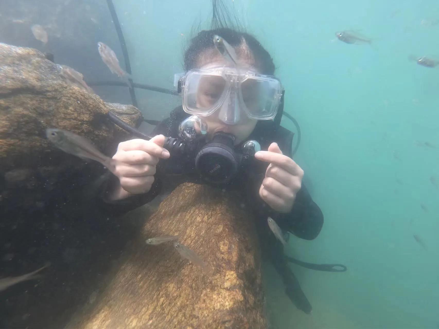 茶足飯飽后姐妹兩人直奔這次上島的主要目的地——潛水基地,客服拿出一張價(jià)格表,不同潛水項(xiàng)目?jī)r(jià)格各不相同,從120到998都有。因?yàn)榕_(tái)風(fēng)剛剛過(guò)境,姐姐向往的外海深水潛項(xiàng)目暫時(shí)沒(méi)有開(kāi)放,客服推薦398元的一種項(xiàng)目。教練細(xì)心又耐心,有經(jīng)驗(yàn)。小女兒年齡小,手動(dòng)排壓失敗,教練就帶著她潛淺水,體驗(yàn)喂魚捉魚。大女兒膽大,教練就帶著她深潛去看珊瑚,海水能見(jiàn)度超高,不愧有東方夏威夷之稱。