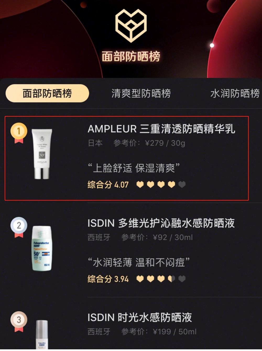 AMPLEUR四季防曬亦是不斷受到明星達人力薦和種草,連續(xù)兩年蟬聯(lián)小紅心大賞榜單1位。