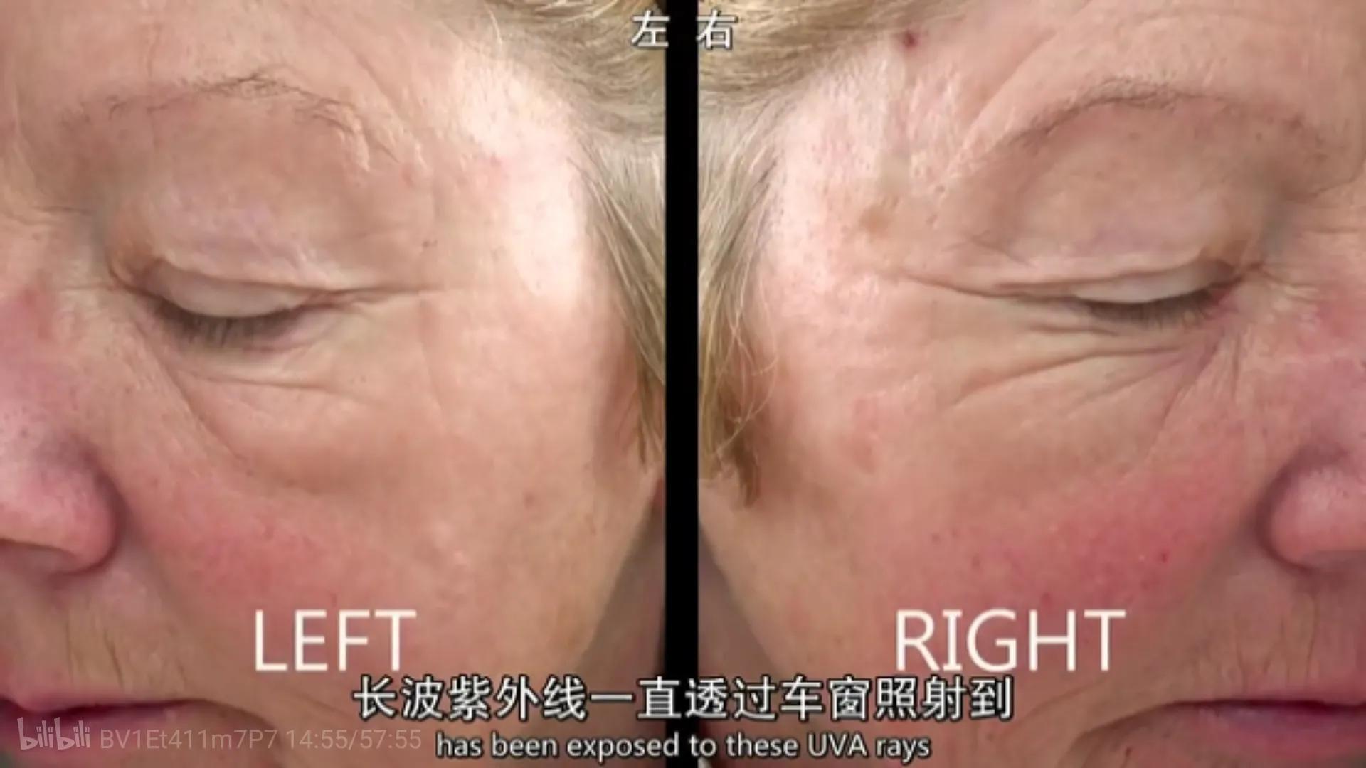 女司機的右臉比左臉的皺紋多,因為她駕駛時,右臉經(jīng)常被光照到,長波紫外線可以透過玻璃照到臉上(太陽的短波紫外線會曬傷皮膚,但長波紫外線會導(dǎo)致皮膚老化),陽光為皮膚衰老承擔了3/4的責任。