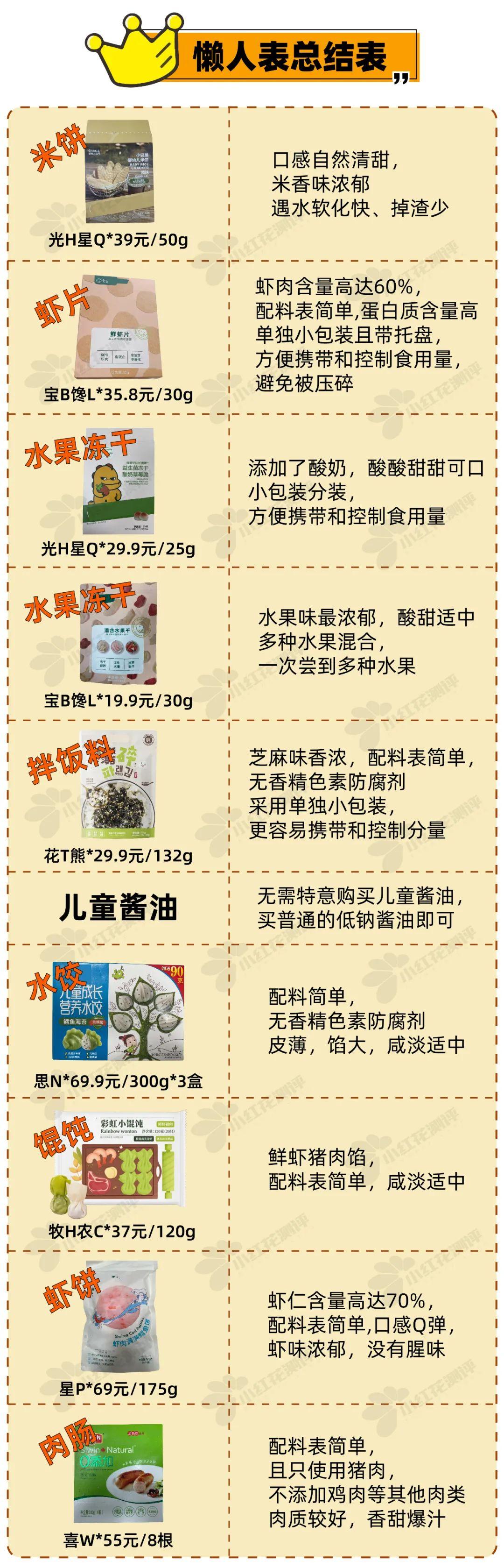 總結(jié)以上9種寶寶食品,除了兒童醬油,花爸不推薦之外,其他8種都幫大家選出了配料表相對簡單、口感好、性過關(guān)的品牌,列舉如下: