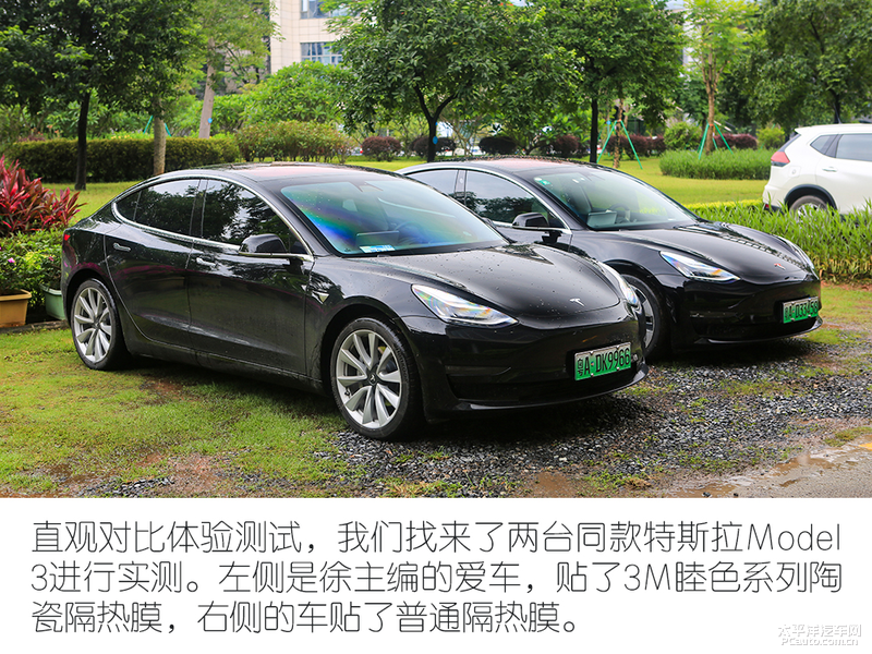 接下來我們就來看看防眩光體驗測試,將會把兩臺特斯拉Model 3相隔3米對向而停,并且開啟遠光燈照射對方,從而感受體驗前風擋隔熱膜對眩光的抑制果。