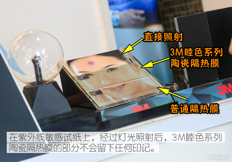 僅僅只是通過光學透過測試儀器得出的數(shù)據(jù)是不夠說服力的,我們還找來紫外線敏感試紙進行測試。通過燈光照射,普通車膜和直接照射會在試紙上留下印記,而3M高端納米陶瓷隔熱膜「睦色系列」則沒有出現(xiàn)任何痕跡。