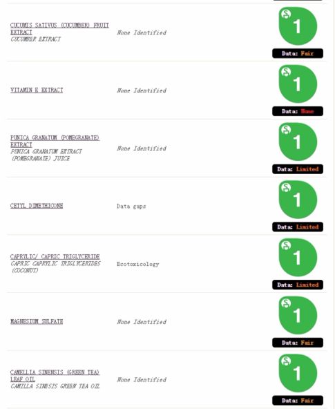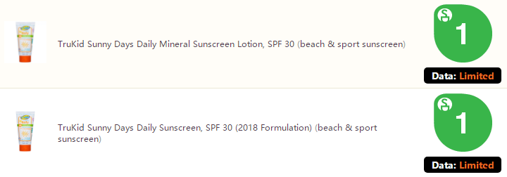 在美國(guó)護(hù)膚用品評(píng)測(cè)的網(wǎng)站EWG上,Trukid的系列防曬霜各種用料的級(jí)別都是1,屬于低風(fēng)險(xiǎn)的級(jí)別。