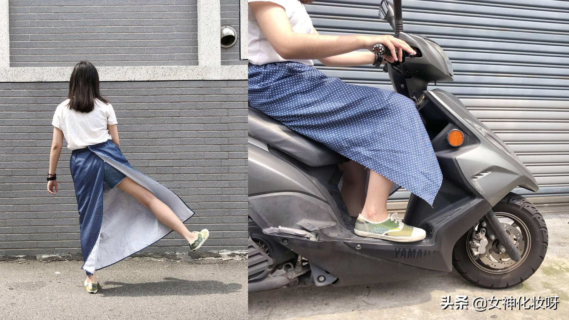 我手邊這款防曬裙長度,站著的時候約落在我的腳踝,坐上機(jī)車后長度直接縮到小腿肚……穿短褲短裙的時候,背后的大開口還會因為坐墊太熱被燙到。