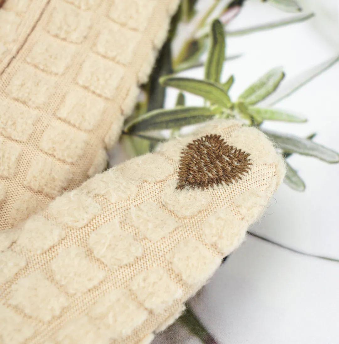 手套的大拇指和食指的指尖位置有萌萌的愛心圖案,它們不僅是裝飾使用,其實(shí)是導(dǎo)電紗材質(zhì)。