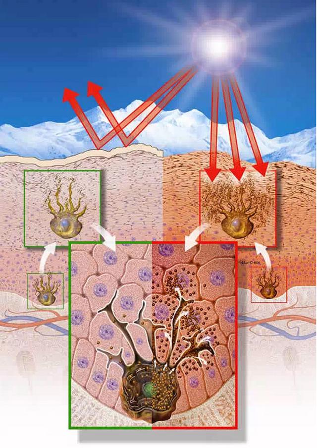 UVA負責傷害你皮膚層的彈性纖維和膠原蛋白纖維,皮膚就會變得脆弱,容易產(chǎn)生皺紋,這就是光老化。西方人熱衷于曬太陽,曬出健康的小麥色肌膚,但總體來說皮膚不如東方人細膩,也老得快。UVB負責把你的皮膚曬紅(曬傷),曬傷后黑色素就開始生成使皮膚變黑,甚至導致曬斑的形成。