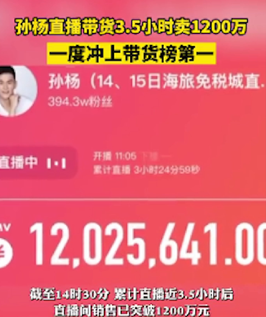 1月14日的那場直播,孫楊憑借高人氣和高銷量直沖帶貨榜第一位,短短3.5小時(shí)就賣出1200萬,絲毫不輸流量明星帶貨的節(jié)奏。