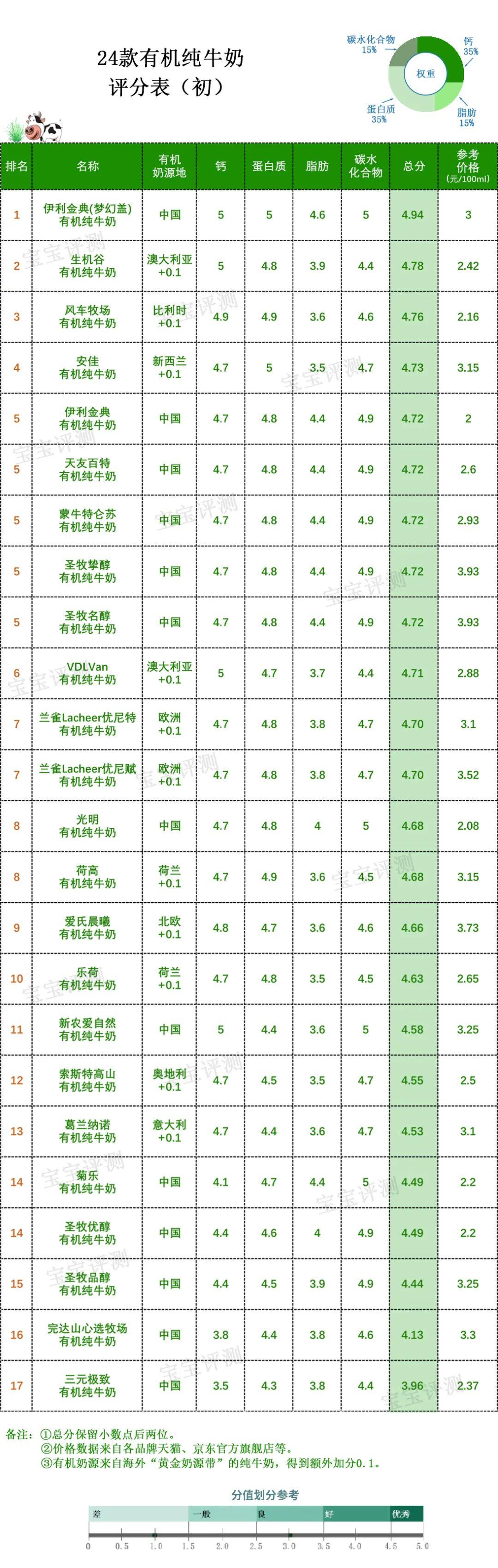 僅從營(yíng)養(yǎng)成分表標(biāo)識(shí)來(lái)看,24款有機(jī)純牛奶營(yíng)養(yǎng)價(jià)值的終得分及排名情況如下: