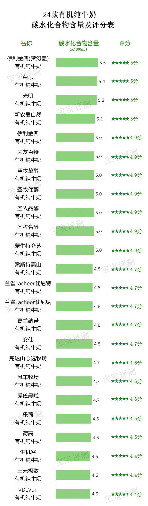 2、在24款有機(jī)純牛奶中,伊利金典(夢(mèng)幻蓋)有機(jī)純牛奶的碳水化合物含量高,達(dá)5.5g/100ml。其他23款碳水化合物的含量在4.5g/100ml-5.4g/100ml之間。