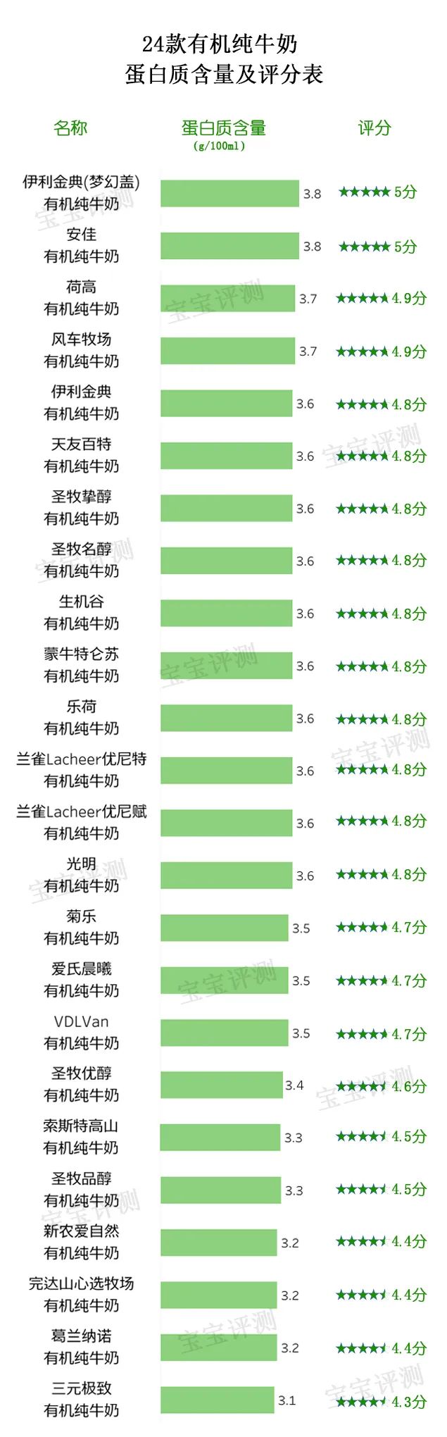 1、《GB 25190—2010食品標(biāo)準(zhǔn) 滅菌乳》中規(guī)定,常溫純牛奶的蛋白質(zhì)含量需≥2.9%。24款有機(jī)純牛奶的蛋白質(zhì)含量均符合中國(guó)國(guó)標(biāo)。