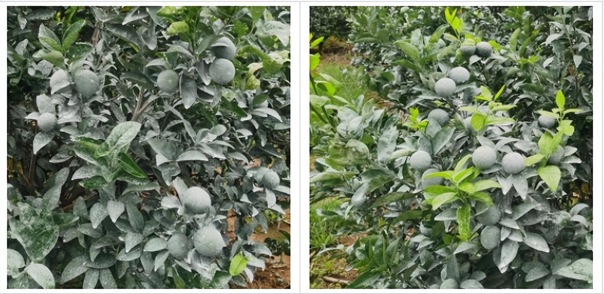 稀釋倍數(shù)沒有定值(根據(jù)噴施器具而變化),以佳噴施密度為準(zhǔn),一般我們用噴霧器噴是50倍-75倍,就是1桶500-750斤水。要是用風(fēng)炮機(jī)這種水量大,霧化高的這種噴就可以噴到100倍,也就是1桶1000斤水。無人機(jī)的話,無人機(jī)的話,可10-20倍稀釋使用。有客戶用過,覆蓋度、均勻度和果他能接受。若有想要用無人機(jī)噴霧的可先少量嘗試看過覆蓋度再做決定。注意飛行速度需要降低,以增加每棵樹打水量,避免用水量過少,覆蓋度不夠的情況出現(xiàn)。總之噴之前可以先試試,比如用噴霧器噴施,需要間隔一定距離,不能太近。先試試自己家的噴霧器75倍果如何(等干了才能看到,所以噴之后等下,等干了觀察),不行再加濃到50倍。這里展示下一些噴霧果: