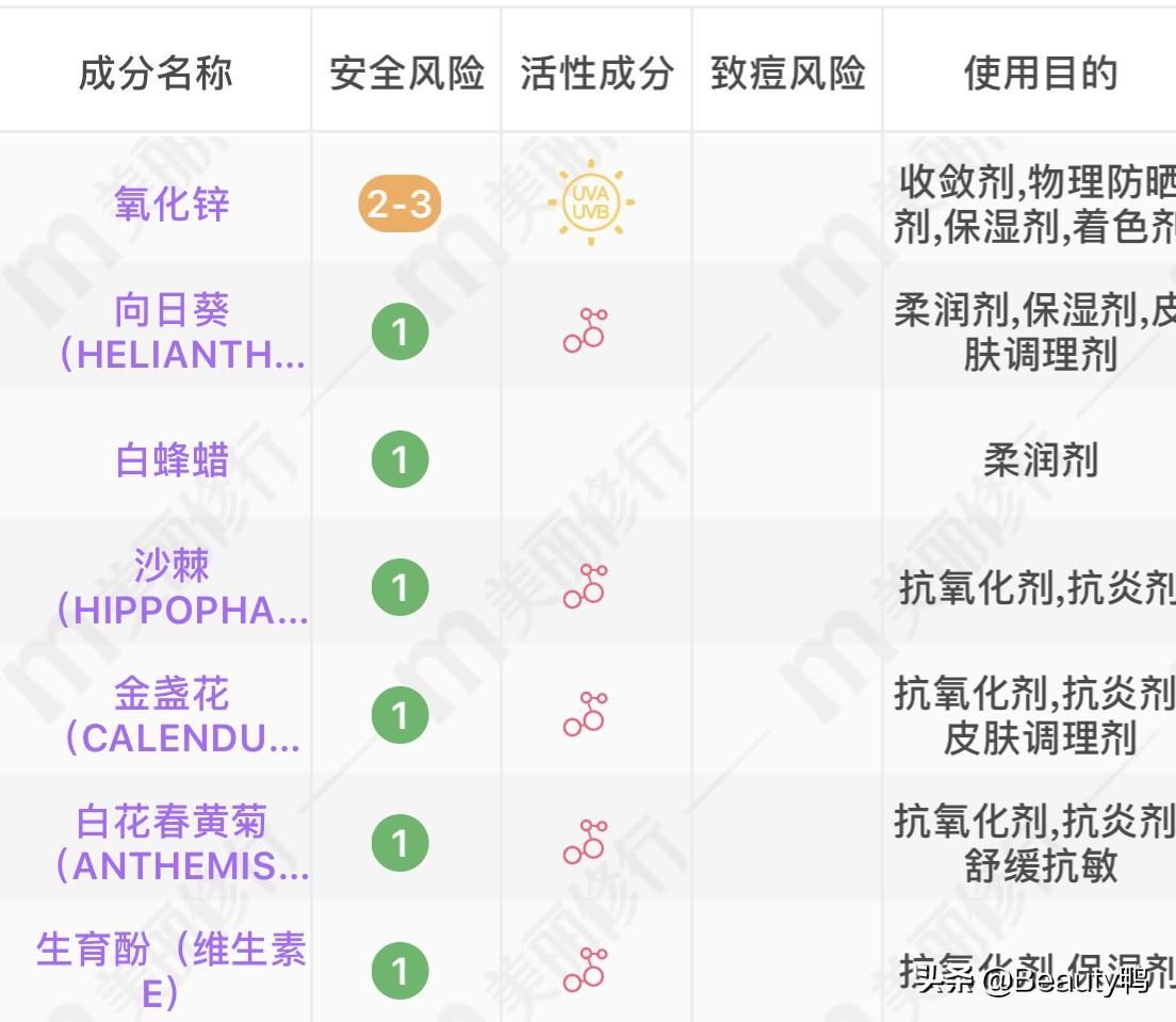 可以看到,只有7種成分,的一種活性防曬劑成分是物理防曬劑氧化鋅,自然防護(hù)果沒有那么好,但是真的是沒什么能導(dǎo)致過敏的化學(xué)物質(zhì)。同時(shí),純物理防曬霜使用后,會(huì)泛白,而且偏油,不適合油性肌膚。