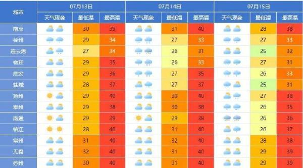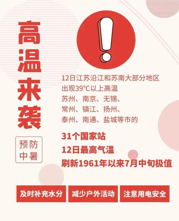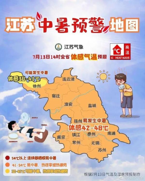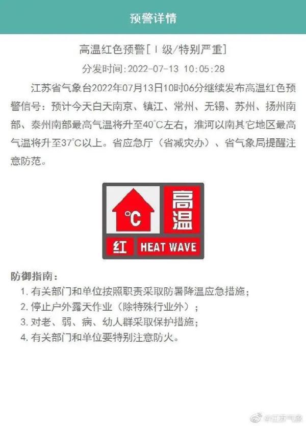 江蘇7月13日繼續(xù)發(fā)布高溫紅色預(yù)警,預(yù)計(jì)今天白天南京、鎮(zhèn)江、常州、無錫、蘇州、揚(yáng)州南部、泰州南部高氣溫將升至40℃左右,而受濕度等因素影響,實(shí)際的體感溫度將更高!