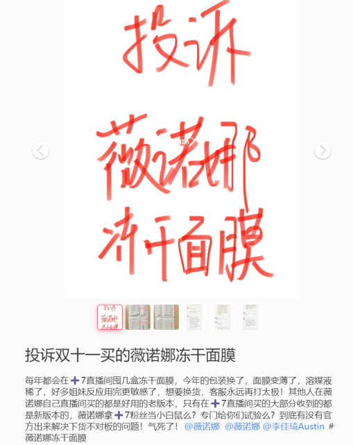 在小紅書平臺上不少網友稱,今年雙11在李佳琦直播間入手的“薇諾娜舒緩修護凍干面膜”與薇諾娜旗艦店的同款面膜,包裝有所差別,以及李佳琦直播間展示的面膜樣板,與實際收到貨的面膜包裝不同,貨不對板。還有多位網友稱,使用了該款面膜后出現(xiàn)了發(fā)紅發(fā)癢、過敏等現(xiàn)象?!稗敝Z娜拿粉絲當小白鼠么?”
