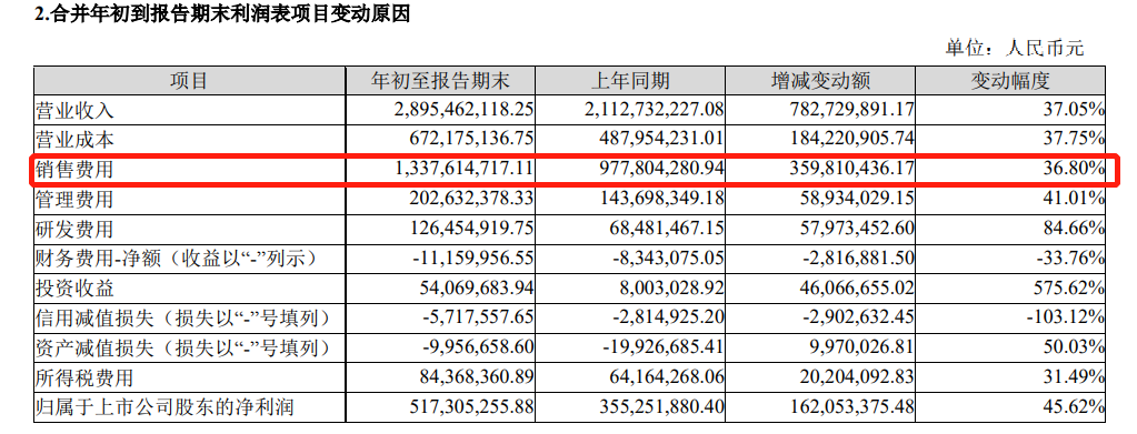 三季度財報顯示,貝泰妮前三季度累計銷售費用13.4億元,同比增長36.8%;累計銷售費用率為46.2%,也就是說,如果產品賣100塊錢,其中有將近一半的錢要用來做營銷。