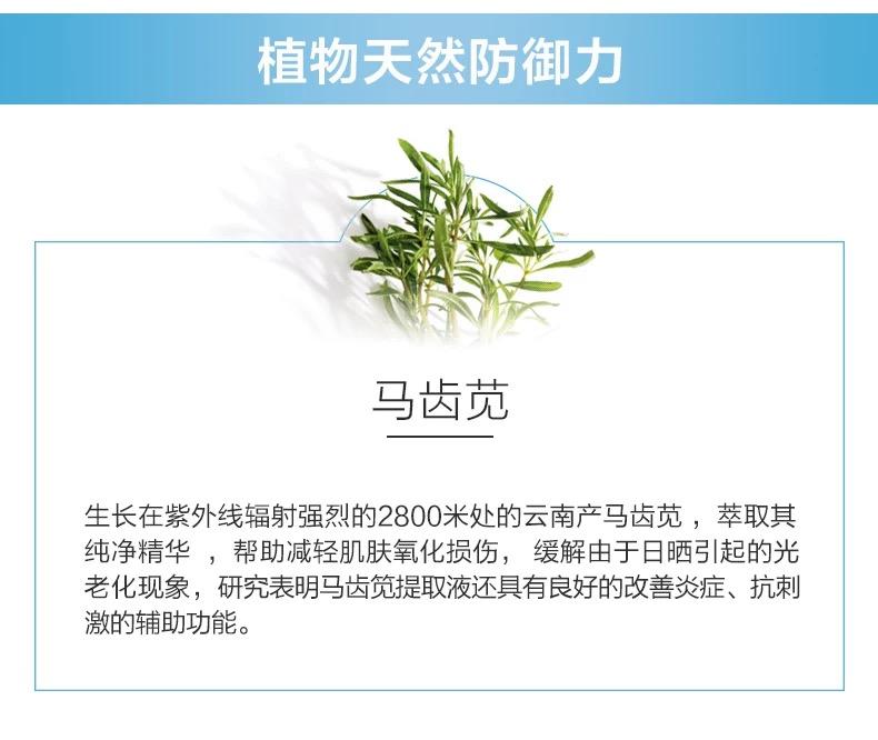 很多品牌的防曬霜為了提高防曬度和持久度,成分上總有一些刺激性。所以一般很少見在防曬的配方上添加鎮(zhèn)靜肌膚的植物提取成分,而這款的配方還添加了足足3種:馬齒莧提取物、紅沒藥醇、姜根提取物。對敏感肌實在太親切啦,可以很好的鎮(zhèn)靜和舒緩肌膚,尤其是紅沒藥醇作為一種常見的消炎成分,已經(jīng)廣泛應(yīng)用到許多護膚品中,可想而知這款防曬霜是有多溫和,敏感肌的姑娘,買它就沒錯了~