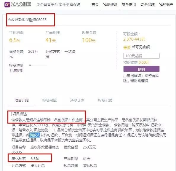 在分利寶曾經(jīng)發(fā)行的名為“名創(chuàng)瑤海店融資”的產(chǎn)品中,其風控措施中寫道:品牌總部資金結算中心為該筆提供連帶擔保;品牌總部已收取足額加盟金,以平臺投資者資金回收。