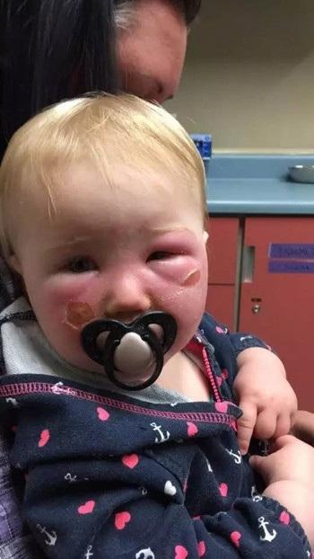 Cannon給女兒噴上防曬霜的當(dāng)天,陽光也不是特別熾烈。但擦完當(dāng)天,Kyla的皮膚就開始有一些紅腫,第二天早晨起來就開始腫脹變紅,甚至出現(xiàn)水泡,小姑娘的臉蛋幾近毀容狀態(tài),可憐。