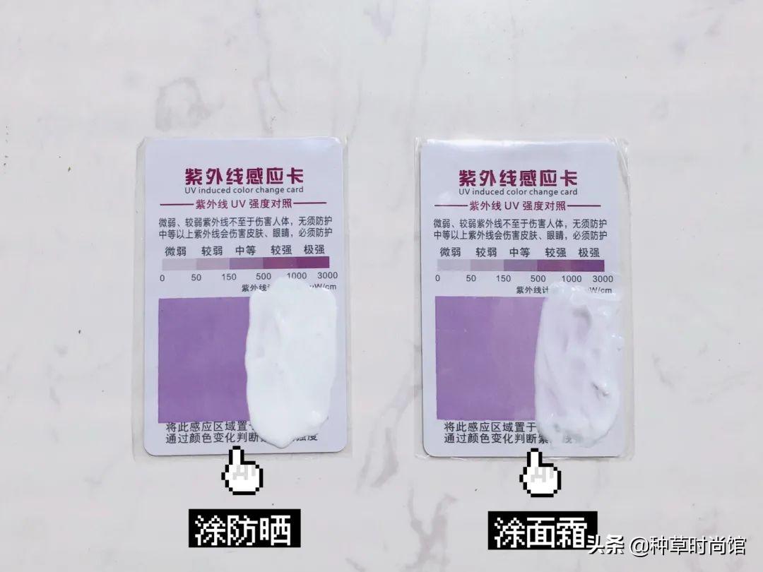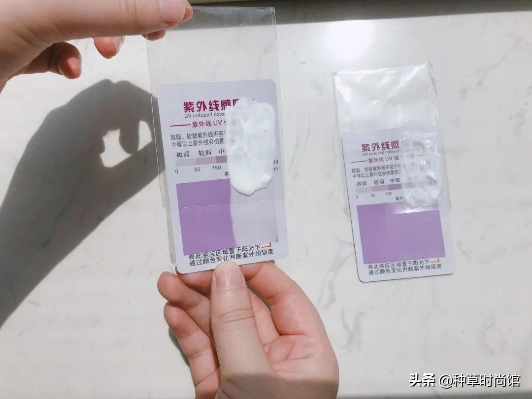 在太陽暴曬下,我把兩張紫外線卡分別涂上防曬和面霜做對比,可以看出涂過防曬這邊還是白色,而只涂乳液的那一張直接全曬紫了,這下大家知道防曬有多重要了吧!