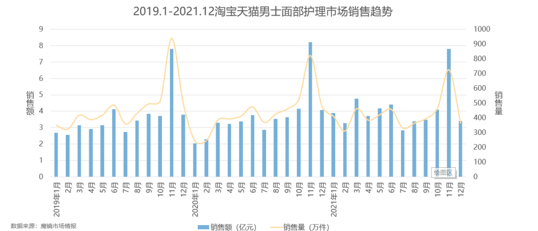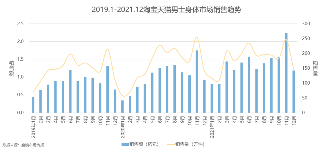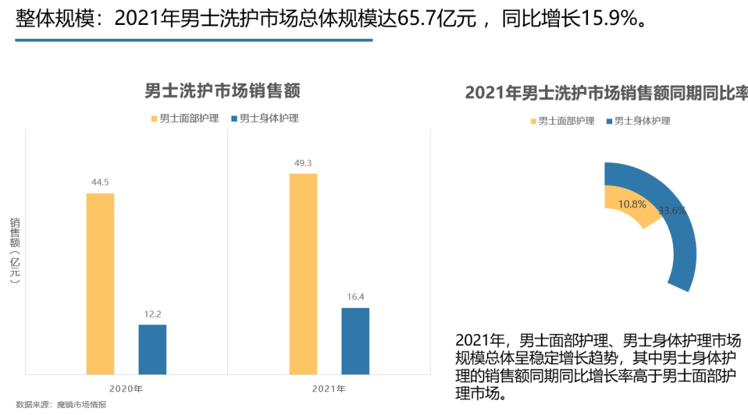 魔鏡認為,男士洗護市場整體呈現(xiàn)穩(wěn)定增長態(tài)勢,2021年線上天貓?zhí)詫氄w銷售規(guī)模達65.7億元,同比增長15.9%。其中男士身體護理的銷售額同期同比增長率高于男士面部護理市場。