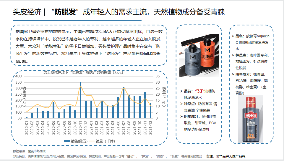 隨著生活節(jié)奏的變快,工作壓力和精神壓力變成了脫發(fā)的助燃劑,差點就把年輕人的頭發(fā)燒光了。所以能看到,購買防脫發(fā)的年輕人也越來越多了,其中天然成分更受關(guān)注。
