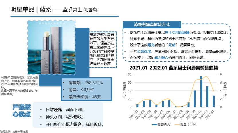 發(fā)現(xiàn)一個有趣的現(xiàn)象,隨著戶外運動的火熱,男士戶外潤唇/防曬護理的需求增加,更啞光、低調(diào)質(zhì)地的潤唇膏獲得男士喜愛。