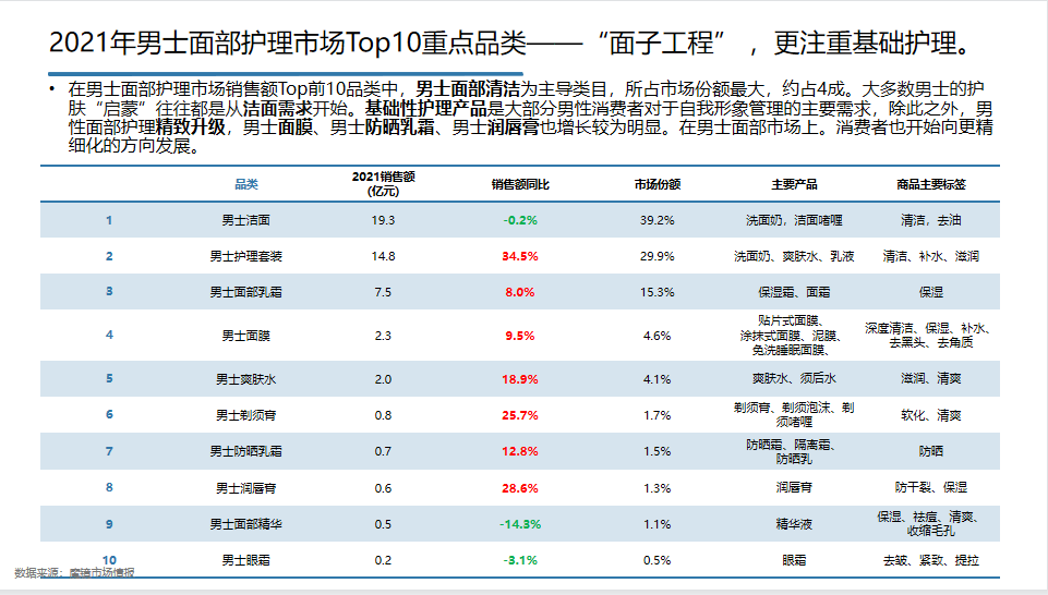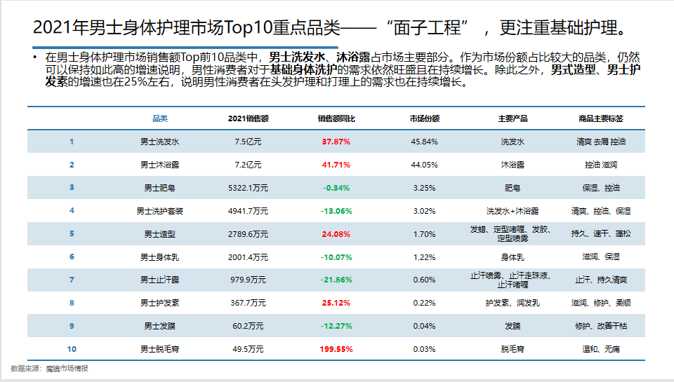在這篇文章里,魔鏡將從男士市場規(guī)模、重點品類和品牌、熱賣產(chǎn)品三方面對其進行研究,帶你一起探究男性洗護市場的新趨勢及突破點。