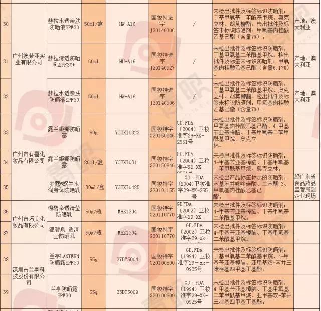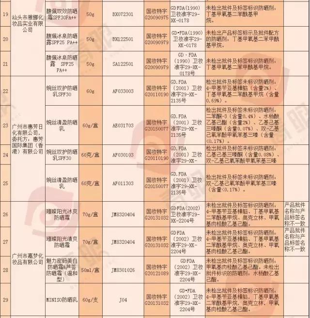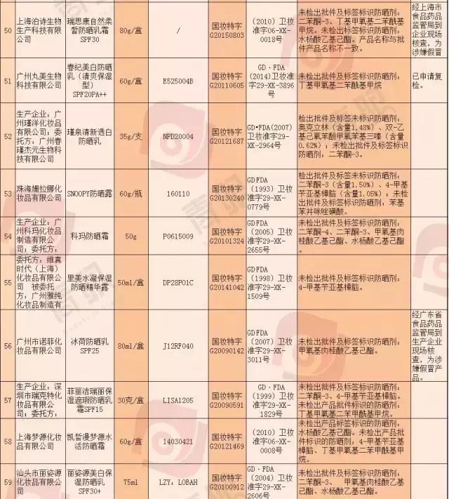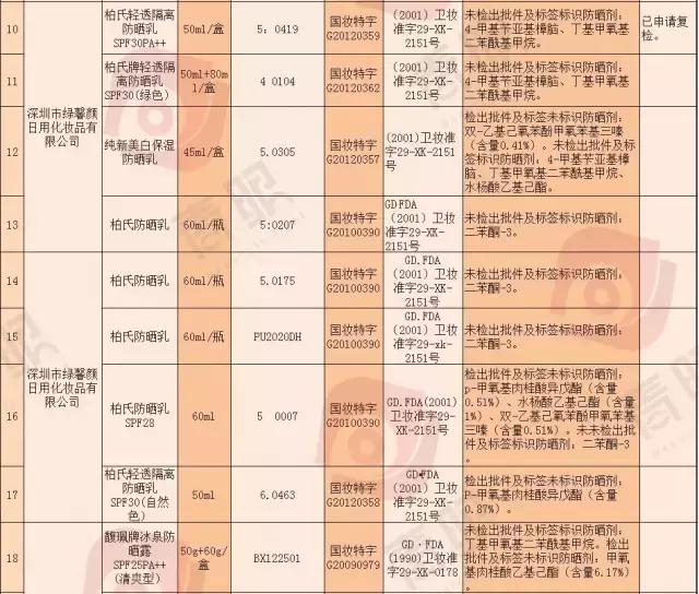 不合格產(chǎn)品的主要問題為實際檢出防曬劑成分與產(chǎn)品批件及標(biāo)識成分不符,其中3批次已申請復(fù)檢。