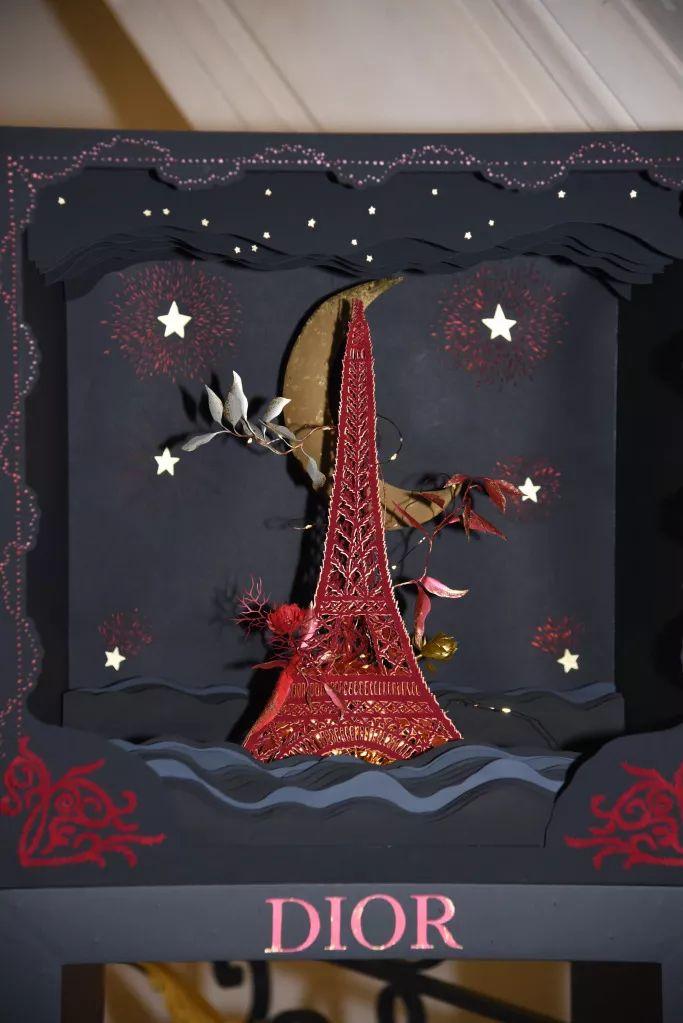 Dior的圣誕樹也以埃菲爾鐵塔為原型,但相比起來迷你了許多,小小紅色的鐵塔被花朵和星星圍繞,與其說是圣誕樹,倒不如說更像中國過年剪的窗花。