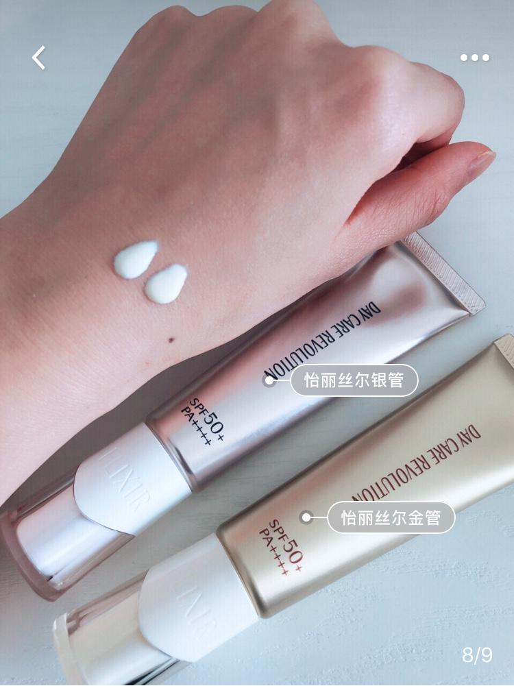 集乳液和防曬與一體,質地乳液狀,易推開,不泛白,含初級抗老成分,銀管更適合夏天,干皮可以選金管。