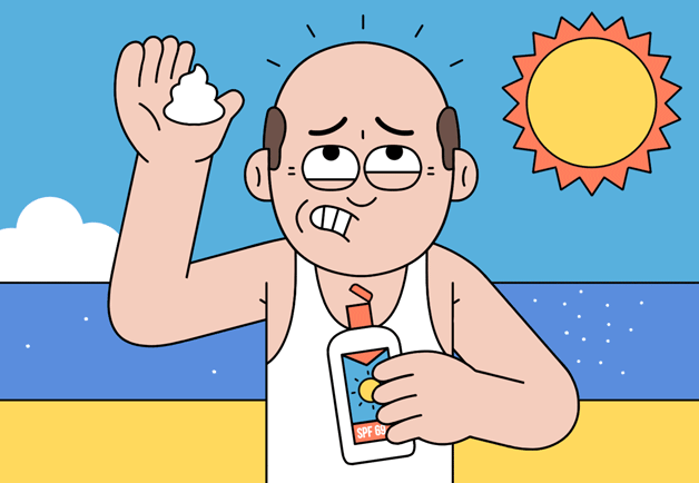 既然脖子以下的皮膚要抹防曬霜,禿頂佬,你腦袋上面頂?shù)哪菈K正對陽光的禿皮,你的第二張臉,也要抹。