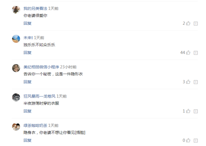 連網(wǎng)友們的評(píng)論也很搞笑,“這是一件隱身衣,可能你被綠了吧,你的老婆并不想讓你看見(jiàn)哈哈哈”現(xiàn)在這個(gè)年代,如果有太多的知識(shí)盲區(qū)還真的不好混啊。