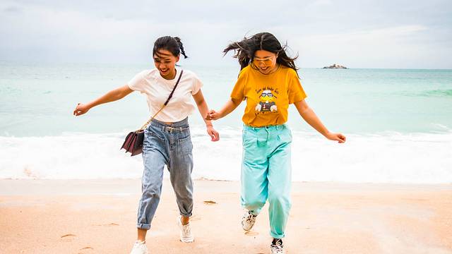 但是盡管這樣的天氣,依舊無法阻擋游客的腳步,海灘邊的人潮依舊洶涌,我們也很開心,想靠近海浪,又怕海水侵吞我們的鞋子,于是跟海浪玩起了一次一次的追逐游戲。