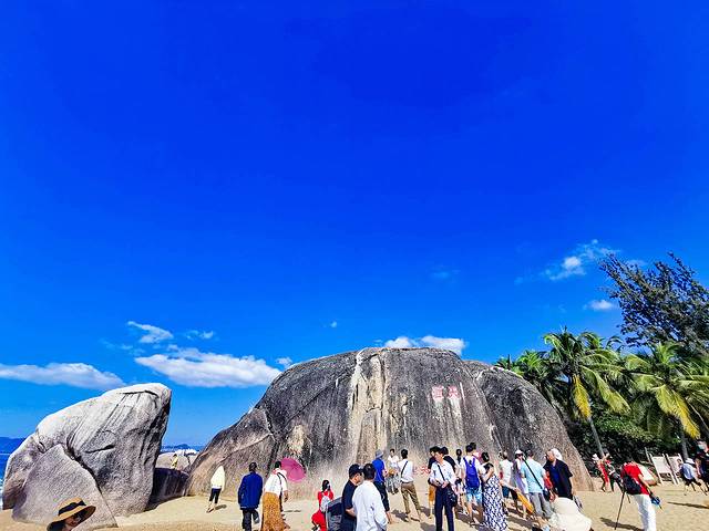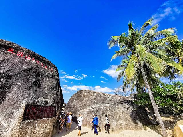 財富石,是南天一柱,也是很有寓意,代表著財富。民間流傳一個香港富商生意落敗后,與石頭親密接觸后,回香港生意重新經(jīng)營紅火起來。 和老公在此留影?!疤煅摹焙汀昂=恰边@兩塊大石頭也是有來歷的, 傳說一對熱戀的男女分別來自兩個有世仇的家族, 他們的愛情遭到各自族人的反對,于是被迫逃到此地雙雙跳進(jìn)大海,化成兩塊巨石,永遠(yuǎn)相對。后人為紀(jì)念他們的堅貞愛情,刻下“天涯”“海角”的字樣。感人的愛情故事,天涯海角永相隨。