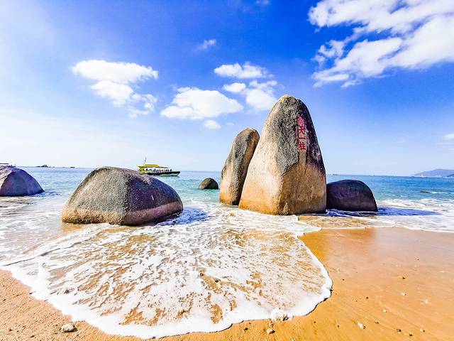 天涯海角的旅游景點集中在海岸線上,沙灘上分布著很多又大又高的大石頭,這些大石頭可以說是整個旅游景點的精華部分,幾乎每一個來到這里的游客,都會站在一側(cè)跟這些大石頭合影。相傳這些石頭還有著一個美麗的愛情傳說,但其實傳說只是傳說,人們把它們幻化成故事,卻也給這里增加了一絲浪漫氣息。