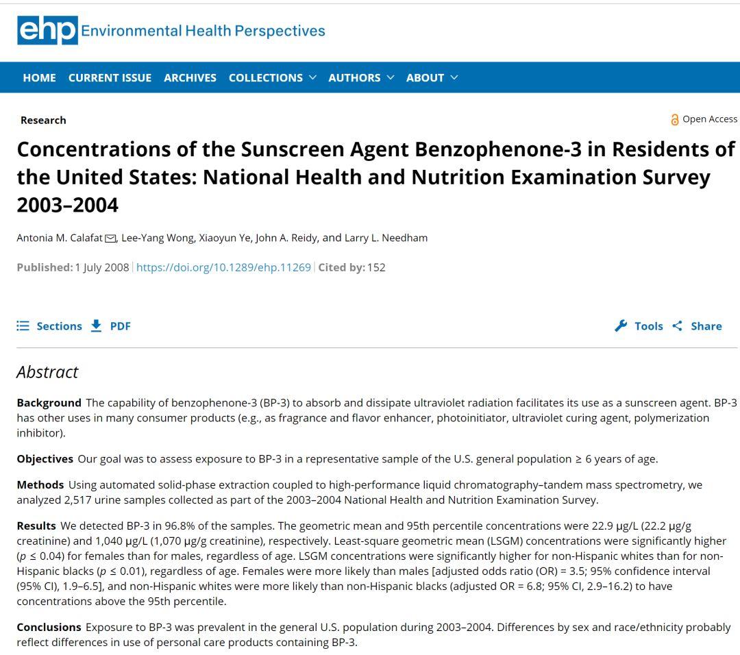 早在1997年就已有研究發(fā)現(xiàn),防曬霜的有成分可以出現(xiàn)在人體中,特別是在2008年美國疾病預防控制中心(CDC),基于《營養(yǎng)和健康調(diào)查》的數(shù)據(jù)收集到的97%的尿液樣本中都有二苯酮-3,尤其是和男性相比,女性防曬霜用得的比較多,所以濃度高于男性。