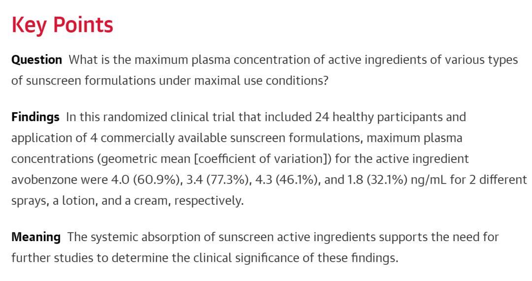 這項由24名健康人對于4種市面上賣的防曬配方進行的實驗結(jié)果顯示:有些成分真的能夠被人體所吸收,雖然劑量談不上特別的高,仍然超過了FDA的指導性意見,提示還是有必要進行進一步毒理學研究的。