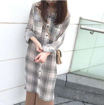 格子雪紡襯衫女學(xué)院風(fēng)中長(zhǎng)款松防曬服