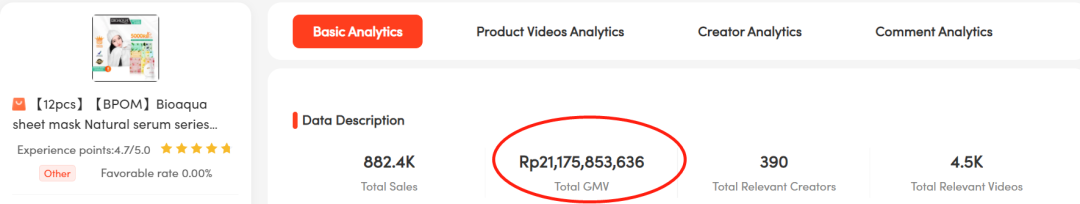 今年 6 月以來,BIOAQUA 的 TikTok Shop 銷量與銷售額都排在印尼小店榜前列。據(jù)第三方數(shù)據(jù)平臺(tái) Tichoo 統(tǒng)計(jì),其爆款面膜從 2021 年 11 月上線以來銷售額已經(jīng)累計(jì)約 847 萬人民幣。更重要的是,BIOAQUA 成為了一個(gè)被多數(shù)人認(rèn)為從 0 到 1 在 TikTok 上打出品牌的案例。