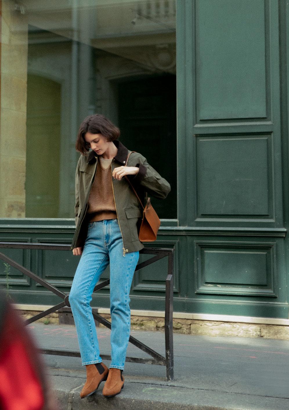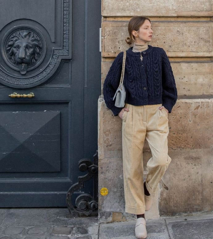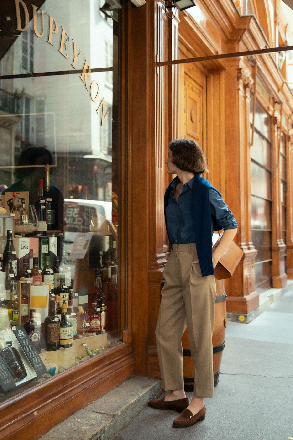 深藍襯衫搭配卡其褲,知性干練毫不猶豫。為了營造逛街的隨意,來一款深藍針織衫疊穿吧,輕輕一披,就是大時髦啊。