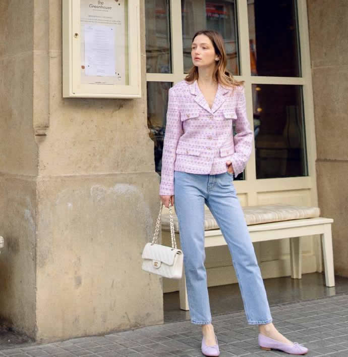 深入骨子里的淑女意象,伴隨著小香風款款而來。雄渾的經(jīng)典力量,歷久考驗。淺粉色外套,利落不失溫柔,搭配淺藍牛仔褲,一粉一藍相得益彰。