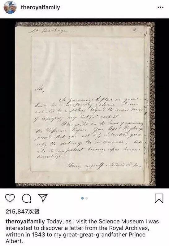 93歲的英國(guó)女王在參觀(guān)科學(xué)博物館之后,用iPad在皇室官方賬號(hào)上分享了數(shù)學(xué)家查爾斯·巴貝奇寫(xiě)給維多利亞女王丈夫阿爾伯特親王的信件圖片,并表達(dá)了自己當(dāng)下的感受。