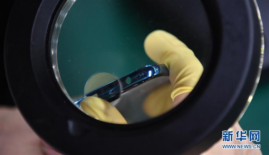 在廣東東莞長(zhǎng)安鎮(zhèn)的捷榮技術(shù)公司車間內(nèi),員工透過放大鏡檢查手機(jī)殼產(chǎn)品(7月16日攝)。 新華社記者 鄧華 攝