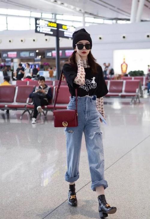 國(guó)內(nèi)另一個(gè)時(shí)尚潮人戚薇,怎么能不趕上這個(gè)時(shí)尚潮流~同樣是經(jīng)典黑白搭,不過(guò)七哥內(nèi)搭的是有紅色印花的防曬衫,更顯俏皮,印花圖案設(shè)計(jì)為她的氣質(zhì)添了幾分帥氣,搭配破洞牛仔褲,時(shí)髦感噌噌噌上漲!