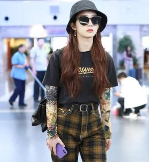 “山支大哥”孟美岐就更絕了,同樣是黑色T恤,孟美岐內(nèi)搭涂鴉印花防曬衫,下身搭配復(fù)古格紋褲子,又高冷又大膽,這“花臂”也太有個(gè)性了吧,街頭感十足呀!