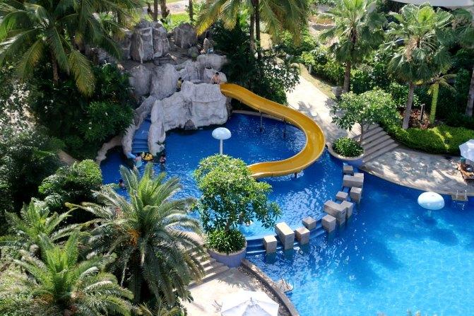 我們住在10樓,的高走在走廊上看樓下的游泳池清澈見底,遠(yuǎn)方還可以看見西島呢,雖然模模糊糊的,但是感覺真不錯(cuò),
