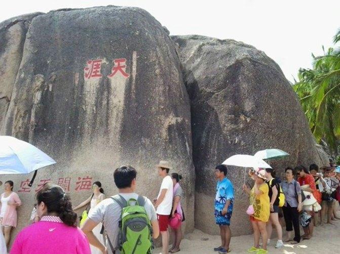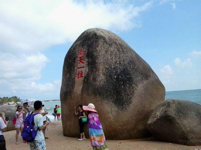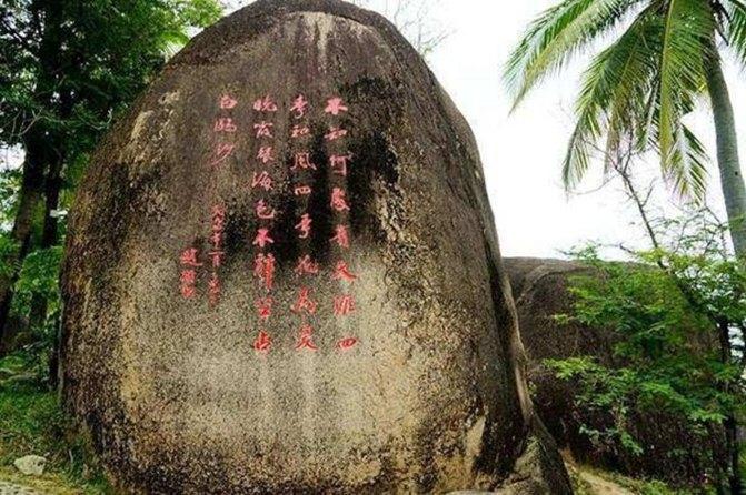 “南天一柱”是一塊高達(dá)7米的巨石,上面刻著清朝宣統(tǒng)年間崖州知州范云梯的筆墨,紅色的四個(gè)大字的顯眼。我國(guó)舊版的2元人民幣背面就是這里了。